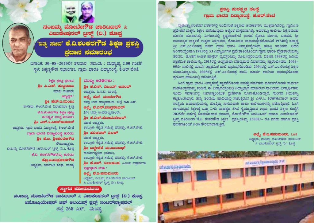 ಗ್ರಾಮೀಣ ಪ್ರದೇಶದ ಮಕ್ಕಳಿಗೆ ಗುಣಮಟ್ಟದ ಶಿಕ್ಷಣ ನೀಡುವ ಉದ್ದೇಶದಿಂದ ಪ್ರಾರಂಭವಾದ ಗ್ರಾಮಭಾರತಿ ವಿದ್ಯಾಸಂಸ್ಥೆ ಕಳೆದ 50 ವರ್ಷಗಳಿಂದ ಶಿಕ್ಷಣ ಕ್ಷೇತ್ರದಲ್ಲಿ ನೀಡುತ್ತಿರುವ ಸೇವೆಯನ್ನು ಪರಿಗಣಿಸಿ 2025-26ನೇ ಸಾಲಿನ ನಂಜಮ್ಮ ಮೋಟೇಗೌಡ ಚಾರಿಟಬಲ್ & ಎಜುಕೇಷನಲ್ ಟ್ರಸ್ಟ್ (ರಿ). ಕೊಪ್ಪ ಇವರು ಕೊಡಮಾಡುವ ‘ನಿತ್ಯಸಚಿವ’ ಕೆ.ವಿ.ಶಂಕರಗೌಡ ಶಿಕ್ಷಣ ಪ್ರಶಸ್ತಿ ಗೆ ಆಯ್ಕೆ ಮಾಡಿರುತ್ತಾರೆ. ಸದರಿ ಪ್ರಶಸ್ತಿ ಪ್ರದಾನ ಸಮಾರಂಭವನ್ನು ದಿ.30-08-2025 ರ ಶನಿವಾರ ಮಧ್ಯಾಹ್ನ 2-00 ಗಂಟೆಗೆ ಸಂಸ್ಥೆಯ ಸಾಹುಕಾರ್ ಎಸ್.ಸಿ.ಚಿಕ್ಕಣ್ಣಗೌಡ ಸಭಾಗೃಹದಲ್ಲಿ ಹಮ್ಮಿಕೊಳ್ಳಲಾಗಿದೆ.