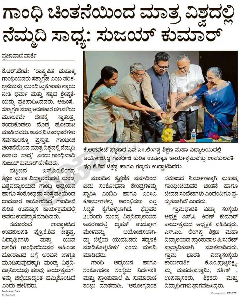 ಗ್ರಾಮಭಾರತಿ ವಿದ್ಯಾಸಂಸ್ಥೆಗೆ 2025-26ನೆ ಸಾಲಿನ ‘ನಿತ್ಯಸಚಿವ’ ಕೆ.ವಿ.ಶಂಕರಗೌಡ ಶಿಕ್ಷಣ ಪ್ರಶಸ್ತಿಗೆ ಆಯ್ಕೆಯಾಗಿರುತ್ತದೆ. ಈ ಪ್ರಶಸ್ತಿ ಪ್ರದಾನ ಸಮಾರಂಭವನ್ನು ದಿ.30-08-2025ನೇ ಶನಿವಾರ ಸಾಹುಕಾರ್ ಎಸ್.ಸಿ.ಚಿಕ್ಕಣ್ಣಗೌಡ ಸಭಾಗೃಹದಲ್ಲಿ ಜರುಗಲಿದೆ ಎಂದು ತಿಳಿಸಲು ಹರ್ಷಿಸುತ್ತೇನೆ.